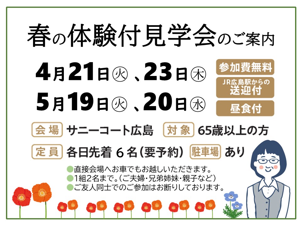 春の体験付見学会を開催します。入居者の皆様と一緒に、体操などの体験や施設見学、昼食時のご歓談を予定しています。先着順ですのでご参加を希望される場合はお早めにサニーコート広島(フリーダイヤル0120-658-321)までご予約ください。