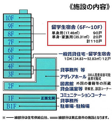 此建筑在为外国留学生提供安全舒适的居住环境,同时也作为国际交流的据点。由广岛县东广岛市的广岛县住宅供给公司协助建设。